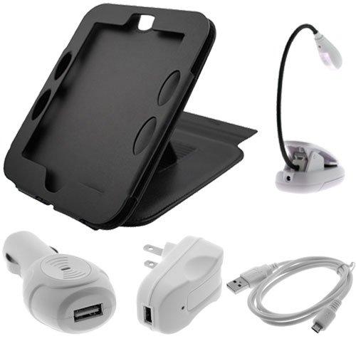 The Detailed Description of GTMax Black Leather PU Stand Case + USB Wall Travel AC Charger + USB Car Charger + Micro-USB Data Hotsync & Charging Cable + White LED Clip-On Reading Book Light for Barnes & Noble Nook Touch, the Simple Touch Reader NEW / Nook 2Features
